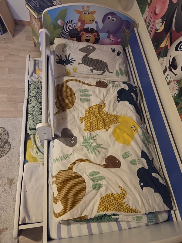 Verkaufe gebrauchtes Kinderbett (1 Jahr benutzt) . Das Bett ist 70 cm breit und 140 cm lang. Es hat Tiermotive am Kopf- und Fussende. Dabei sind Matratze, Bettwäsche, Kissen und Zudecke. Es hat einen Schutz gegen Rausfallen und zwei Schubladen unter dem Bett.Neupreis war 180,00 Euro, ich möchte gern noch 90,00 Euro dafür haben.
