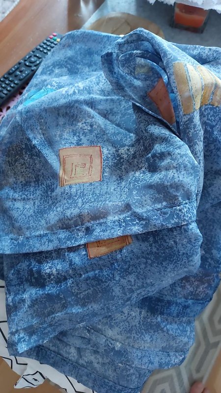Verkaufe ein Set aus 2 Gardinenschals in modernem, verwaschenem Blau mit quadratischen Patchwork-Elementen.