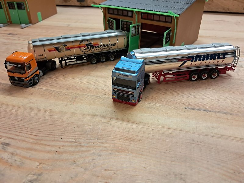 dazu gibt es noch 2 x zweiteilige LKW-Garagen (Hersteller nicht bekannt), Tore 3x beweglich, 1x fest in geöffneten Zustand