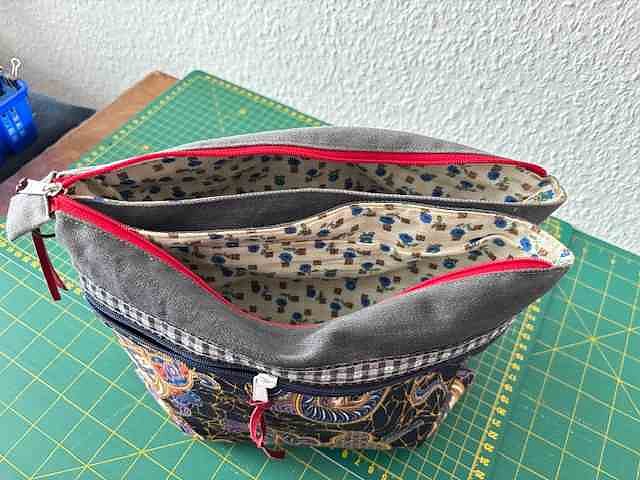 Angeboten wird ein sog. Fünffach-Organizer: 2 Aussentaschen mit Reissverschluss, 3 Innentaschen mit Reissverschluss bzw. Klettband. Mit viel Liebe und indonesischen Stoffen genäht.