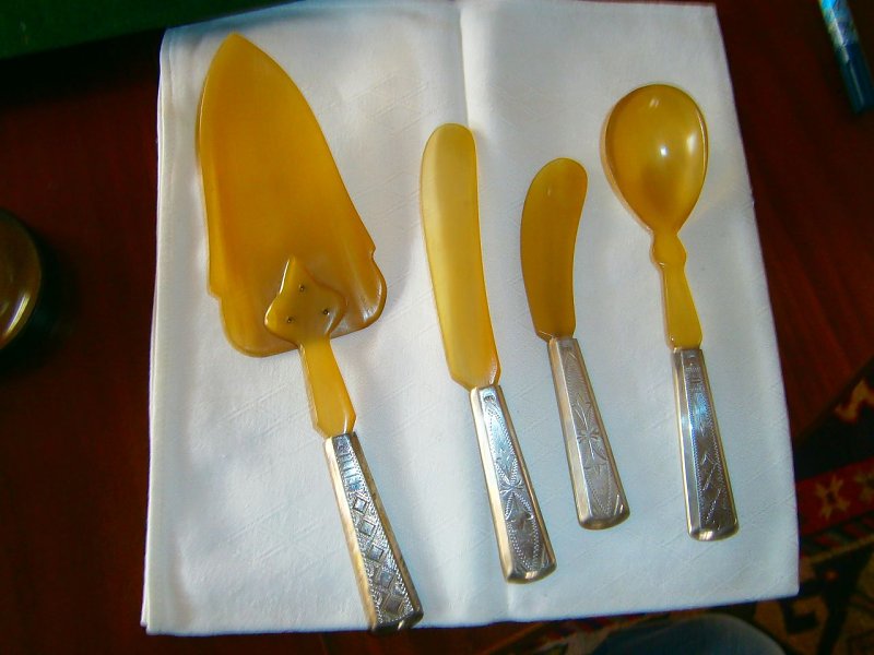 P8020075 (Foto: ) Jugendstil 835 Silber Besteck Horn Buttermesser, Marmeladen Löffel Tortenschaufel um 1910 für 75 Euro