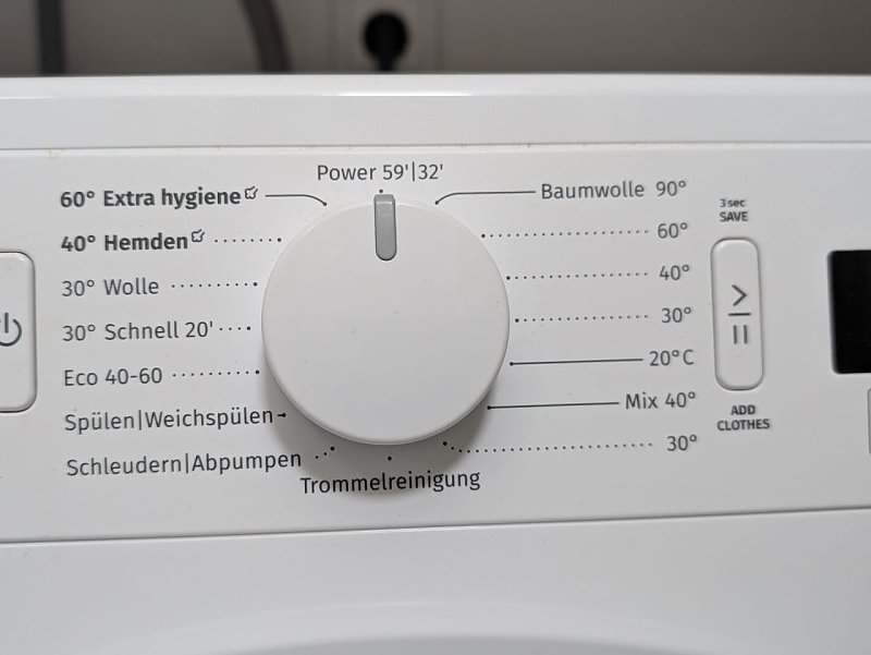 - 15 Programme, darunter: Baumwolle, Synthetik, Wolle, Sport, QuickWash 15 min, Daunen, Eco 40–60 °C u. v. m.