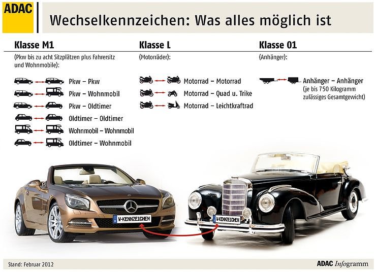 In Deutschland darf das Wechselkennzeichen vorerst nur für zwei Fahrzeuge zugeteilt werden. Und zwar innerhalb der EU-Fahrzeugklassen M1 (Pkw und Wohnmobil), L (Motorräder) und 01 (Anhänger bis 750 Kilogramm). Die Wechselkennzeichen gibt es ab Mitte des Jahres bei den örtlichen Zulassungsstellen. Je Zulassungsantrag entstehen einmalige Verwaltungsgebühren von rund 65 Euro. Die Kosten für zwei vollständige Nummernschildsätze liegen bei rund 40 Euro.