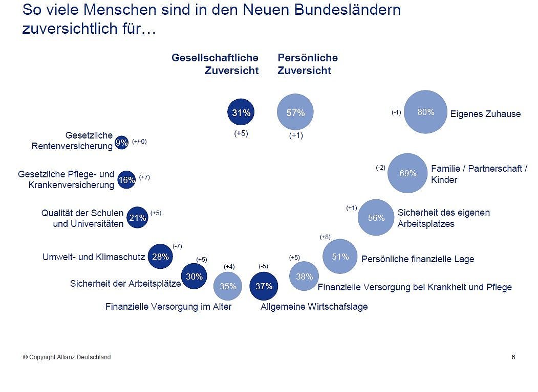 Im Osten Deutschlands steigt langsam die Zuversicht. In den neuen Bundesländern herrscht auch mehr Optimismus für die Zukunft Deutschlands. Das gleiche gilt für den Arbeitsmarkt. So komprimiert sieht es die neue Allianz-Zuversichtlichkeitsstudie, die vor Ihnen vorstellen...