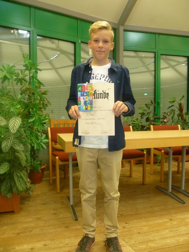 Fynn- Malte Helbing aus der Klasse 6.4 überzeugte in allen Lesebereichen so, dass er als bester Vorleser der 6. Klassen am Marie- Curie- Gymnasium Worbis im Jahr 2012 geehrt werden konnte.Die aus Mitschülern bestehende Jury, aber auch das Publikum wusste die einzelnen Beiträge entsprechend zu würdigen. Alle Schüler bekamen verschiedene Leseaufgaben im schriftlichen als auch mündlichen Bereich und konnten sich so kreativ mit unserer deutschen Muttersprache auseinandersetzen.
