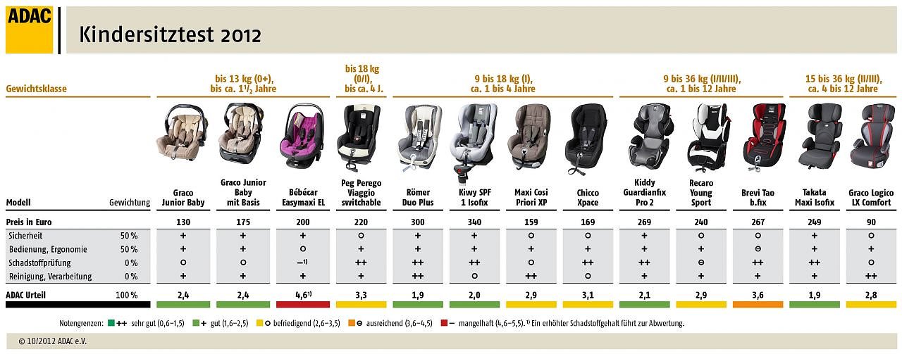 Sechsmal wird die Note gut, fünfmal die Note befriedigend, einmal ausreichend vergeben – ein Sitz fällt bei der Schadstoffanalyse durch und erhält nur ein mangelhaft. In allen Klassen – unterteilt nach Alter, Gewicht und Größe der Kinder – gibt es gute Sitze, die bei Sicherheit und Handhabung punkten und dadurch Unfallfolgen mildern können. So ist der Graco Junior Baby mit und ohne Basis bei den Babyschalen empfehlenswert - beide Varianten erreichten beim Frontalcrash die beste Beurteilung. In der Kategorie I (Kinder zwischen 1 und 4 Jahren) liegen der Römer Duo Plus und der Kiwy SPF 1 Isofix vorne. Der Kiddy Guardianfix Pro 2 überzeugt bei Sicherheit sowie Bedienung und erreicht die Spitzennote in der Klasse I/II/III (für 1-12 Jährige).