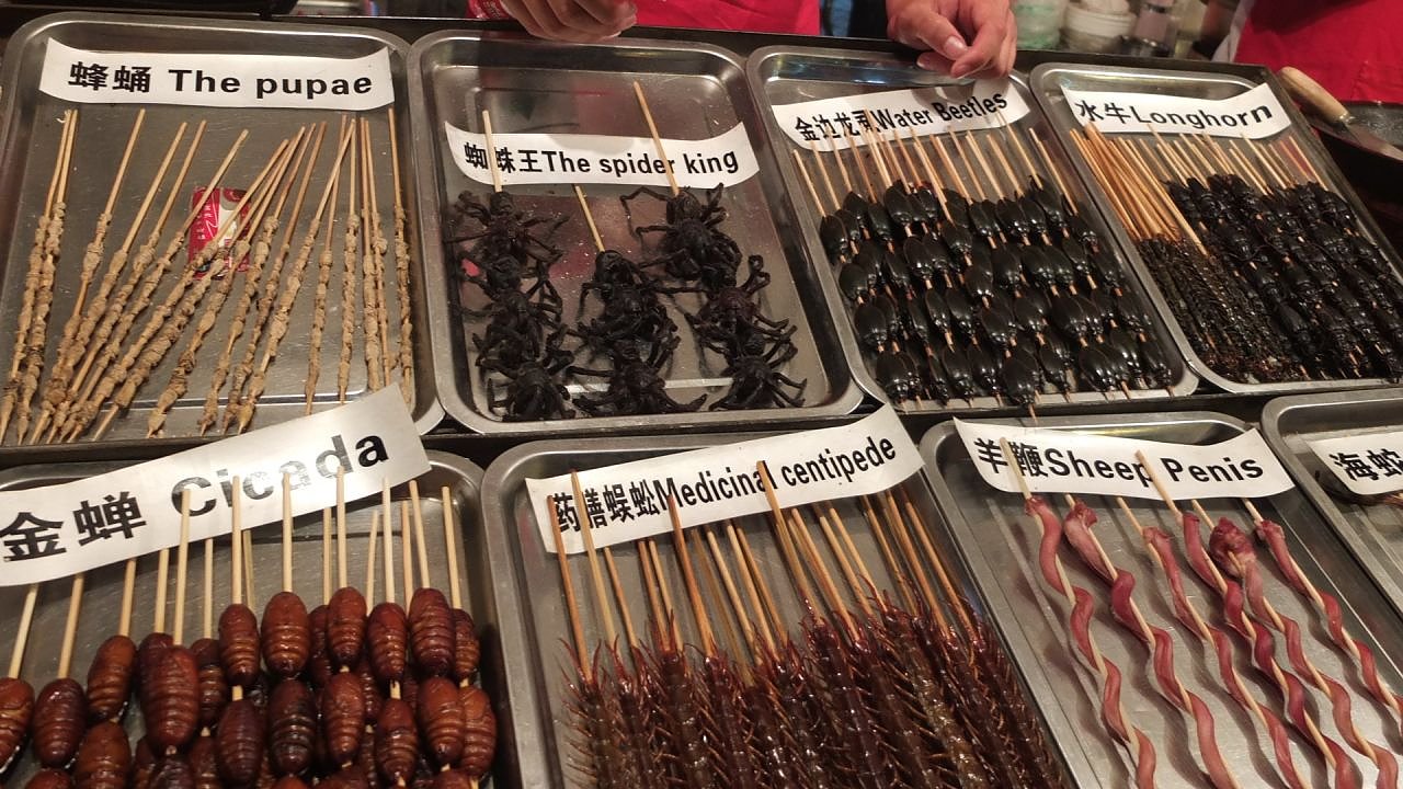 Der Nachtmarkt wartet mit chinesischen Spezialitäten besonderer Art auf. So kann man Skorpione, Schildkröten, Käfer, Raupen, Heuschrecken, Vogelspinnen, Schlangenfleisch und Schlangenhaut, Schafpenisse, Hoden, Frösche, Seesterne, Seepferdchen, Maden aller Art, usw. am Spieß kosten.