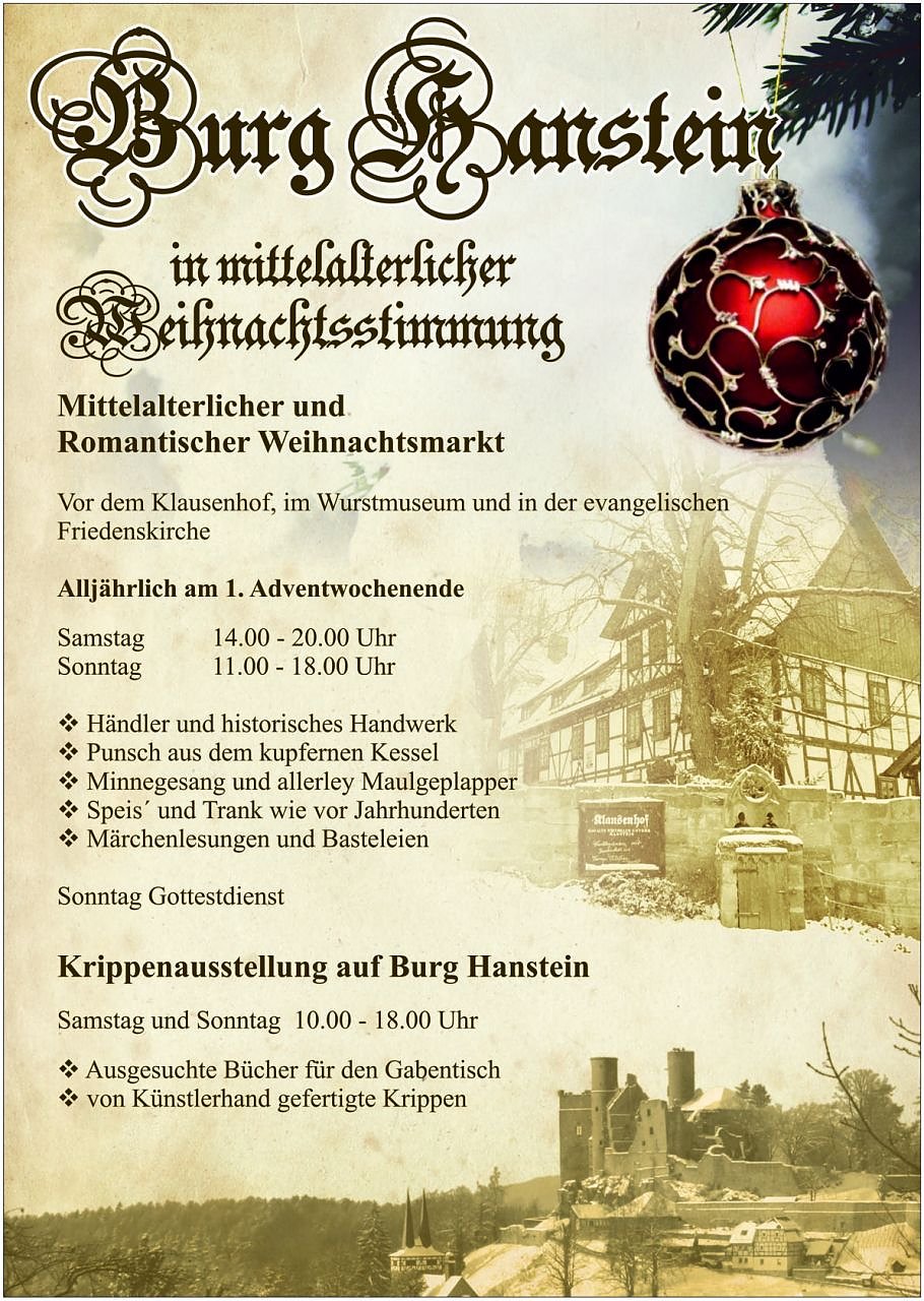 Ein mittelalterlicher und romantischer Adventsmarkt am Fuß der Burg Hanstein erwartet die Besucher am 1. Adventswochenende. Dort hat der Weihnachtsmann einen echten Bart und die Musik wird auf alten Musikinstrumenten gespielt...