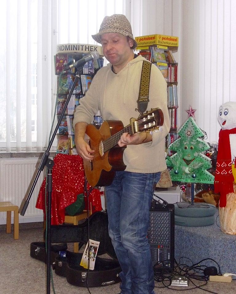 Traditionell vor dem Weihnachtsfest verkürzt die Bibliothek den Kleinen die Wartezeit auf den Weihnachtsmann. Diesmal war nicht Puppentheater angesagt, sondern ein Kinderlieder-Mitmach- Programm mit dem Thüringer Liedermacher Thomas Koppe.