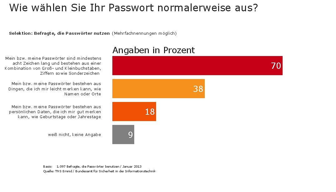 Ein sicheres Passwort für jeden Online-Dienst gehört zu den zehn Basismaßnahmen, die jeder Internetnutzer in Bezug auf die Sicherheit beherzigen sollte, erklärt Michael Hange, Präsident des Bundesamtes für Sicherheit in der Informationstechnik. Die Ergebnisse unserer Umfrage zeigen, dass unsere Aufklärungsarbeit Wirkung zeigt. Über zwei Drittel der Befragten wissen, wie ein starkes Passwort erstellt wird: Es besteht aus Groß- und Kleinbuchstaben, Ziffern sowie Sonderzeichen. Doch auch das stärkste Passwort reiche nicht aus, wenn es nicht regelmäßig gewechselt wird, so Hange weiter. Wer sein Passwort alle drei Monate ändert, macht es Internet-Kriminellen bedeutend schwerer.