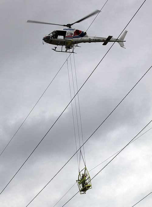 Die Reparaturflüge werden mit einem Hubschrauber vom Typ AS 355 N Ecouril absolviert, einer Maschine mit zwei Hauptturbinen. Bei Reparaturflügen an Hochspannungsleitungen sind zweimotorige Hubschrauber aus Sicherheitsgründen vorgeschrieben. Zudem besitzt der Pilot der Maschine langjährige Flugerfahrung speziell im Bereich des Industriefluges. Dies ist unabdingbar, da die angehängte Gondel und die zur Gewichtsersparnis ausgebauten Türen die Flugeigenschaften der Maschine spürbar beeinflussen. Trotzdem muss der Hubschrauber vom Piloten ohne Wackler mehrere Minuten lang exakt an einer Stelle gehalten werden.