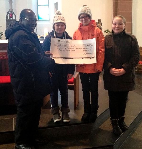 Die Mitglieder der Arbeitsgemeinschaft Vision EINE WELT nutzten die Gelegenheit, um den Erlös des Ugandabasars vom Patronatsfest, sowie des letzten Hungermarsches zu übergeben. So freute sich der Bischof sichtlich über eine stolze Summe von 9000 Euro, für die er sich ganz herzlich bei der Schulgemeinde bedankte. Ohne diese Hilfe wären viele Projekte in seinem Land nicht möglich. Gerade Waisenkinder in Uganda würden damit unterstützt werden. Über diese Kinder berichtete Bischof Kaggwa im gemeinsamen Gottesdienst mit der 5. Jahrgangsstufe.