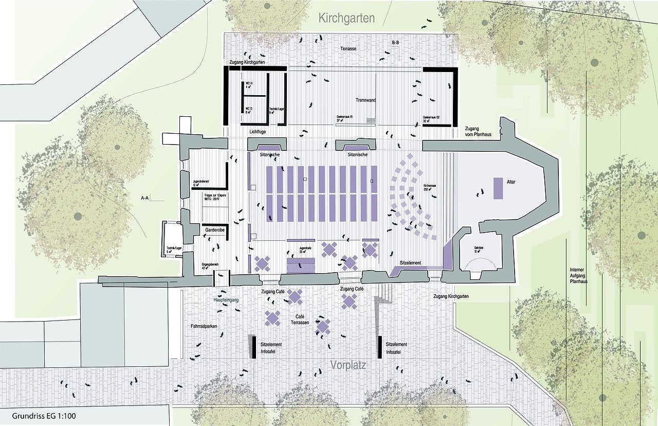 Die Idee, das Jugendcafe zum städtischen Vorplatz zu öffnen, wird … begrüßt. So heißt die Jugendkirche mit dem Jugendcafe auf dem öffentlichen Platz vor der Kirche alle willkommen. Im Westbereich der Südfassade erfolgt der Einbruch eines zusätzlichen Eingangs … . Die Lage dieses Haupteinganges ermöglicht über einen unter der Westempore angeordneten Durchgang die Erschließung der Kirche und des im Nordbereich angeordneten kompakten Anbaus.