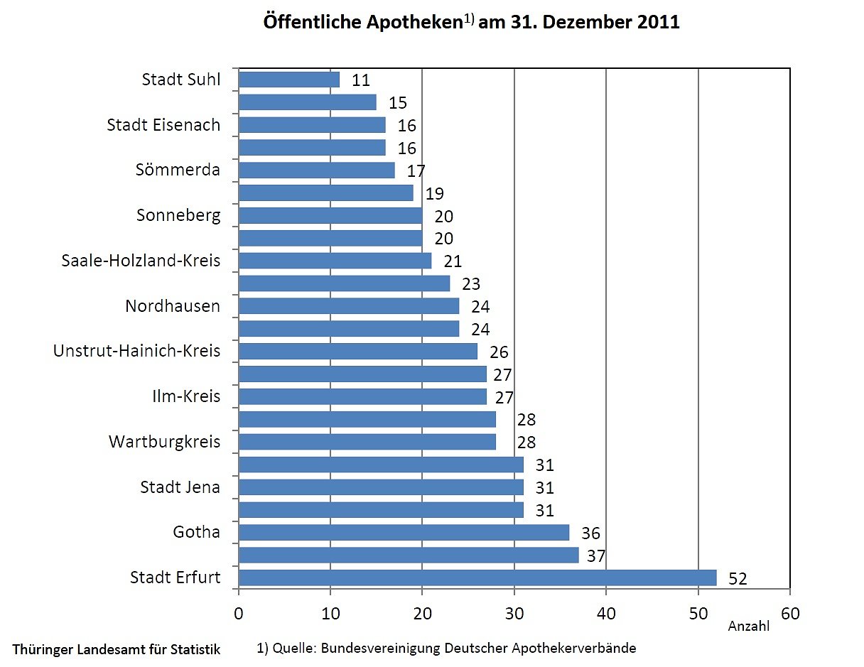 Die Städte Weimar und Eisenach verfügten über je 16 Apotheken (2001: 14 bzw. 15 Apotheken). In der Stadt Suhl gab es mit 11 Apotheken zum Stichtag 2011 zwei Apotheken weniger als zehn Jahre zuvor.