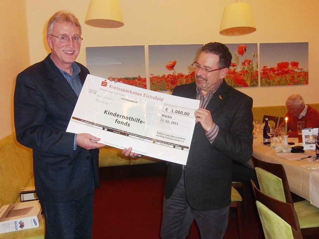 Die Tatsache, dass die Anzahl der Kinder, die auch in Thüringen von Armut betroffen sind, weiter gestiegen ist, wird durch die gehäuften Meldungen in den Medien immer wieder bestätigt. Neben dem Mangel an materiellen Dingen, muss man erleben, dass vielen jungen Menschen die Teilhabe an kulturellen, sportlichen und anderen gesellschaftlichen Angeboten versagt ist, formulierte es Rainer Engel, Geschäftsführer des Diakonischen Werkes Eichsfeld Mühlhausen e.V. Die Rotarier hatten ihn eingeladen, um aus den vielfältigen Benefizveranstaltungen des letzten Jahres dem Kindernothilfefons des Eichsfeldes einen Betrag von 1000 Euro zu übergeben.