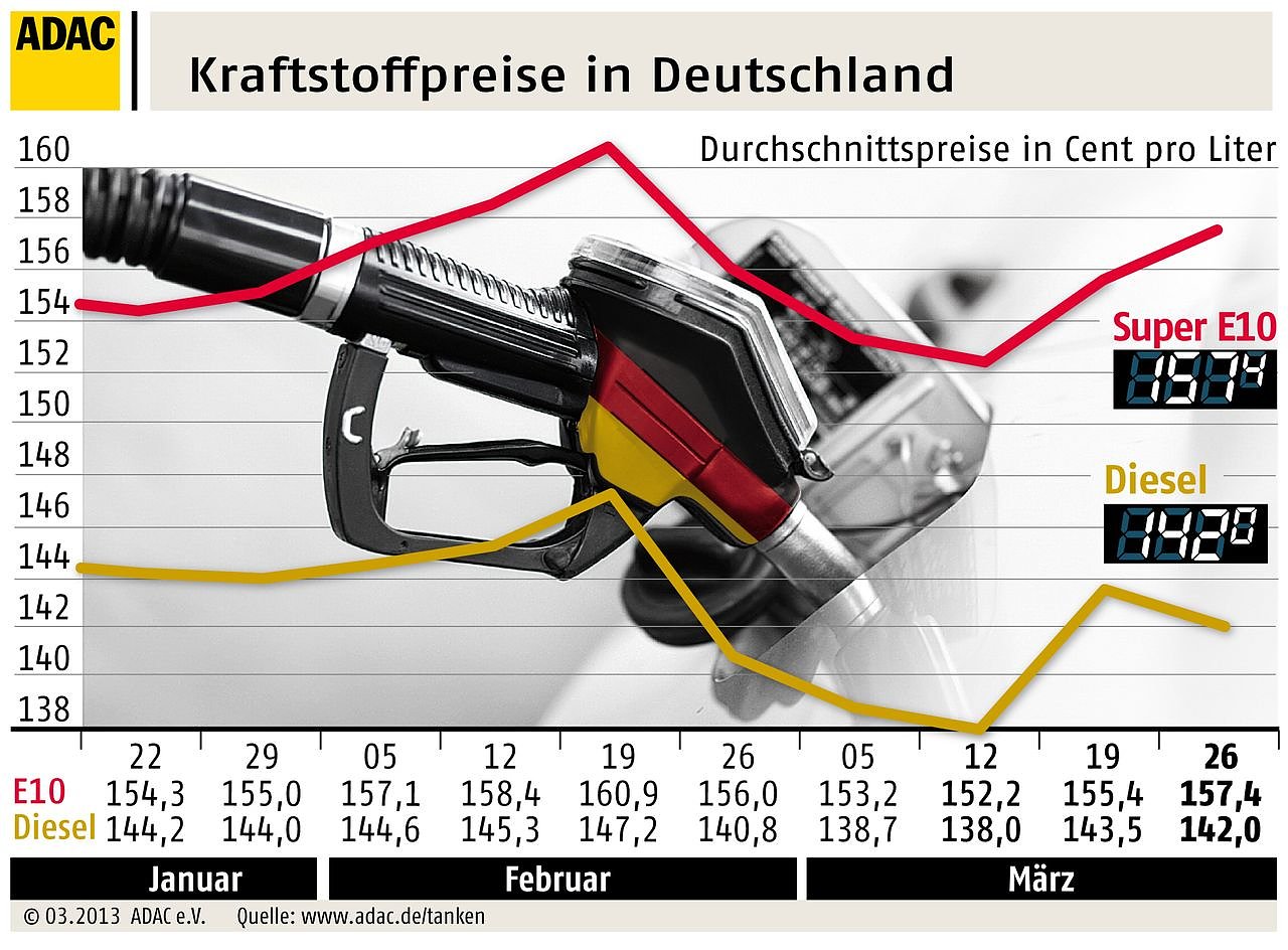 Die erwartete Erhöhung der Kraftstoffpreise in Deutschland vor den Osterfeiertagen ist bislang ausgeblieben. Nach Angaben des ADAC kostet ein Liter Super E10 im bundesweiten Durchschnitt 1,574 Euro, was einem Anstieg von 2 Cent gegenüber der Vorwoche entspricht...