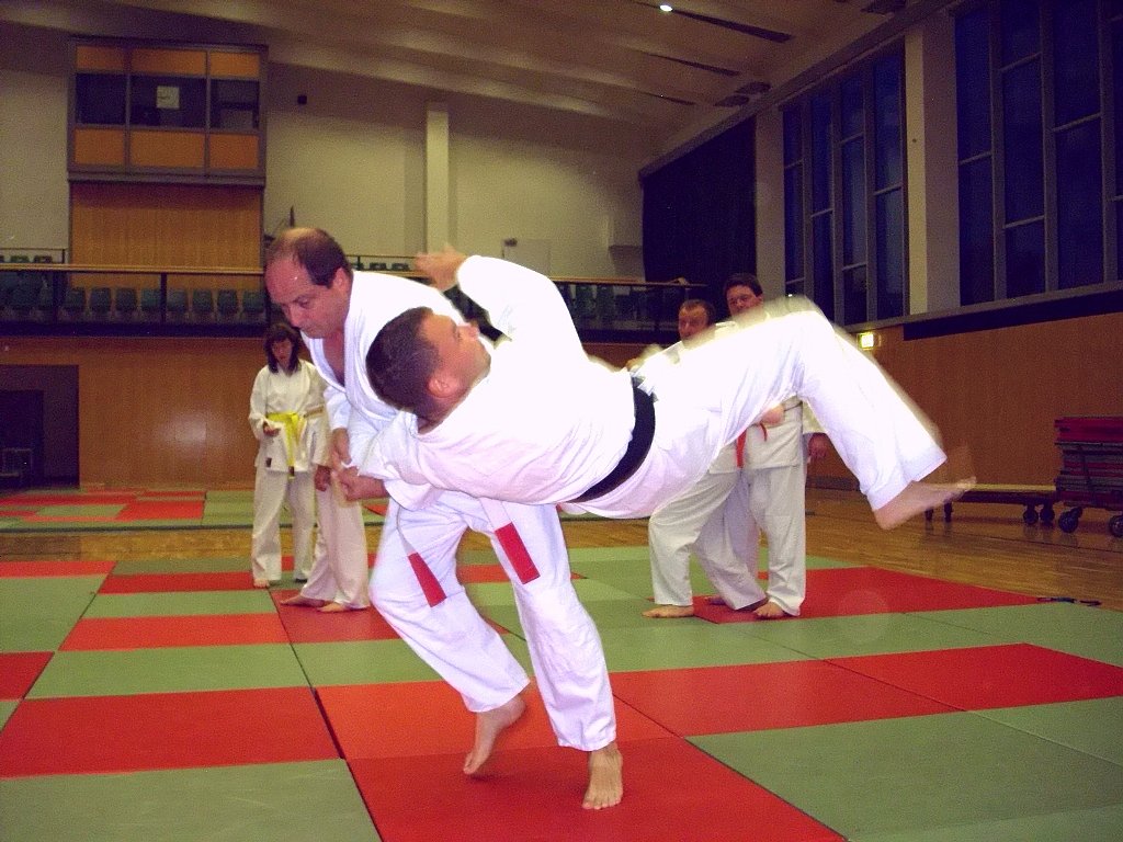 Großmeister Joachim Retzek (7. Dan) wirft Kampfsportmeister Domenic Hesse (3. Dan) mit einer Wurftechnik Ippon-seoi-nage.