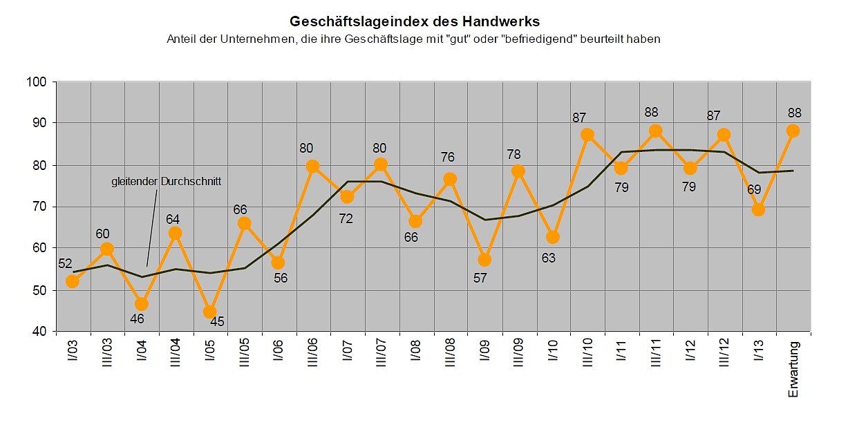 Handwerkskammer-Präsident Stefan Lobenstein: Der niedrige Index ist auf die zu frostigen Temperaturen für den Bausektor und auf die anhaltende Absatzkrise im Kfz-Gewerbe zurückzuführen. Alle anderen Branchen zeigten sich auch über den Winter sehr konstant. Und gerade Auftragsreichweite und Betriebsauslastung sind auf erfreulich stabilem Niveau. Das lässt erwarten, dass wir auch in 2013 ein positives Jahr für das Handwerk erwarten können. Stützpfeiler seien in den letzten Monaten die konsumnahen und die Lebensmittelhandwerke gewesen. Die Gesamtaussichten im Handwerk sind ungebrochen zuversichtlich und befinden sich mit 88 Punkten als Erwartung für das kommende Quartal auf hohem Niveau. verantwortlich für die guten Aussichten sind neben der stabilen Beschäftigtenlage eine weiterhin hohe Auslastung der Betriebe und konstant große Auftragsreichweiten. Gerade im Bau- und Ausbau zeigt sich, dass Sanierung und Neubau weiterhin nachgefragt werden. Die Gründe dafür haben sich nicht verändert. Das Winterloch war also lediglich eine Unterbrechung; wenn auch eine sehr lange. Sorgen bereiten mir jedoch die öffentlichen Haushalte. Viele Kommunen haben immer noch keinen verabschiedeten Haushalt und können keine wichtigen Investitionen anschieben. Je später die Haushalte bestätigt sind, desto später erfolgen die Ausschreibungen und Vergaben., befürchtet Lobenstein eine Stagnation im öffentlichen Baubereich.