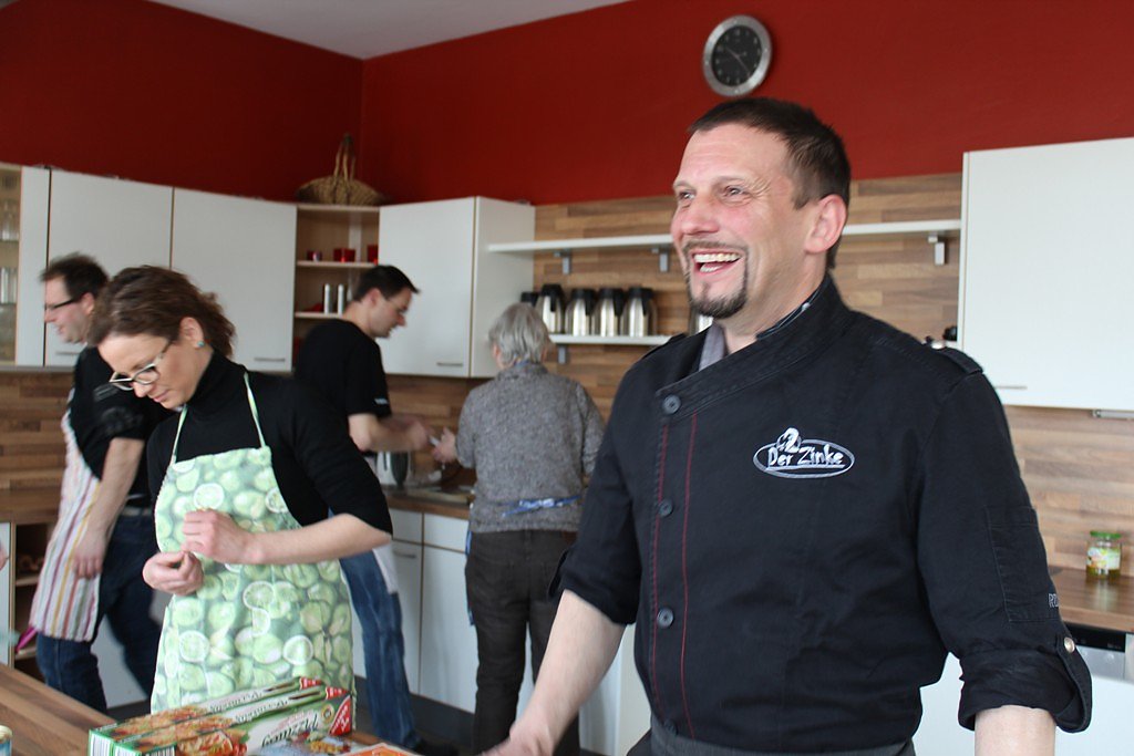 Guido Zinke legt viel Wert auf die Hygiene beim Kochen und so wunderte sich mancher, dass er auch zwischen den einzelnen Verrichtungen immer wieder zum Händewaschen delegiert wurde. Auch auf die akurate Körperhaltung weist er hin:Du bist Koch, kein Fahrradständer selbst das richtige Abschmecken will gelernt sein und Löffel ablecken ist tabu. So legten alle los und schnippelten, schälten, mixten und rührten unter Anleitung von Guido Zinke fleißig.