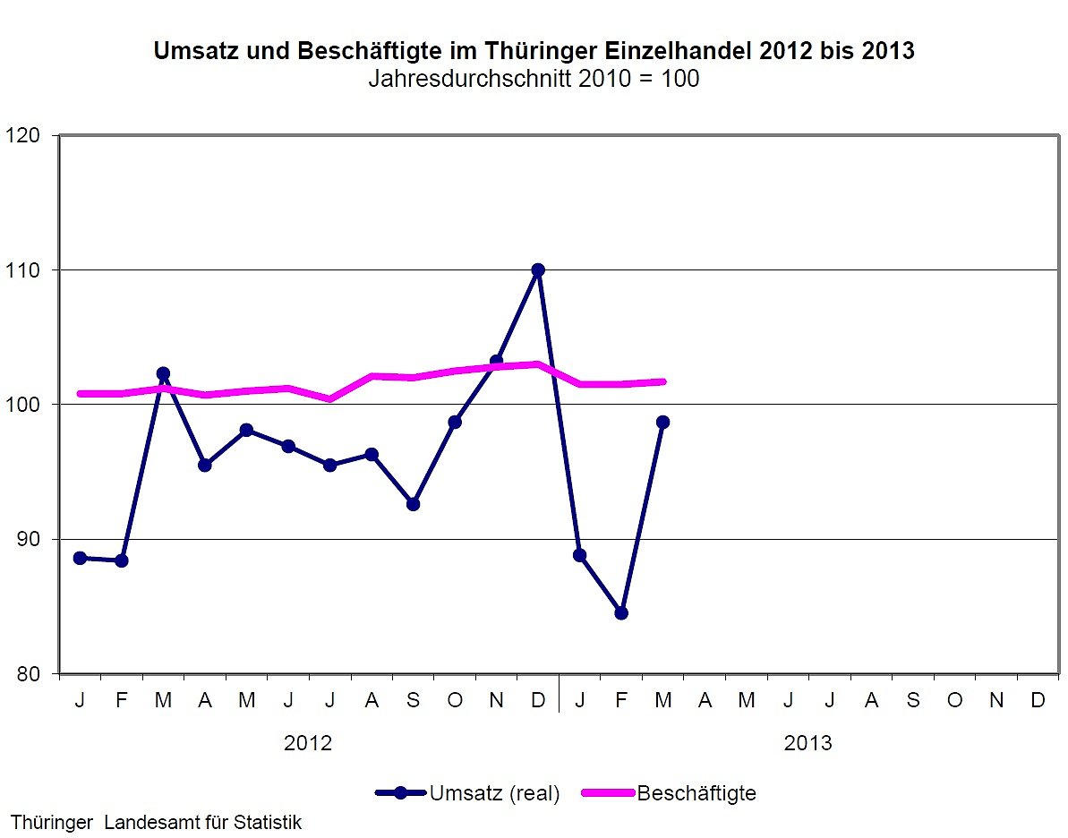 Im 1. Quartal 2013 setzten die Thüringer Einzelhändler nach vorläufigen Ergebnissen des Thüringer Landesamtes für Statistik real, das bedeutet preisbereinigt, 2,6 Prozent und nominal (in jeweiligen Preisen) 1,1 Prozent weniger um als im Vorjahreszeitraum.