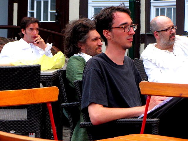 Kritische Blicke: Darsteller und Regieassistent Jakob Kiernemund (im Vordergrund) verfolgen eine Bühnenprobe ihrer Kollegen (Foto: Eva Maria Wiegand).