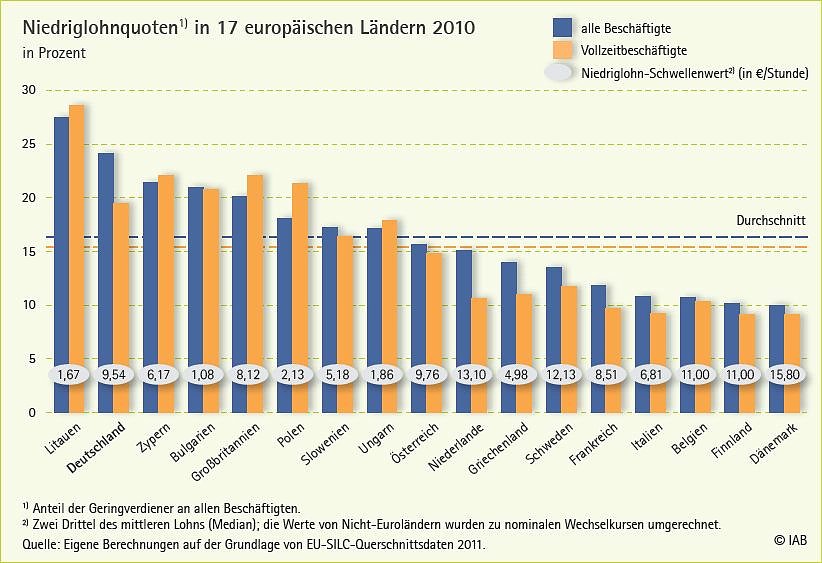 Wie in international vergleichenden Analysen üblich wurde in der IAB-Studie die Niedriglohnschwelle bei zwei Drittel des nationalen Medianlohns angesetzt. Der Medianlohn ist der mittlere Lohn: Die eine Hälfte aller Beschäftigten verdient mehr, die andere Hälfte weniger als den Medianlohn. Dieser Definition folgend lag die deutsche Niedriglohnschwelle im Jahr 2010 bei einem Stundenlohn von 9,54 Euro brutto.