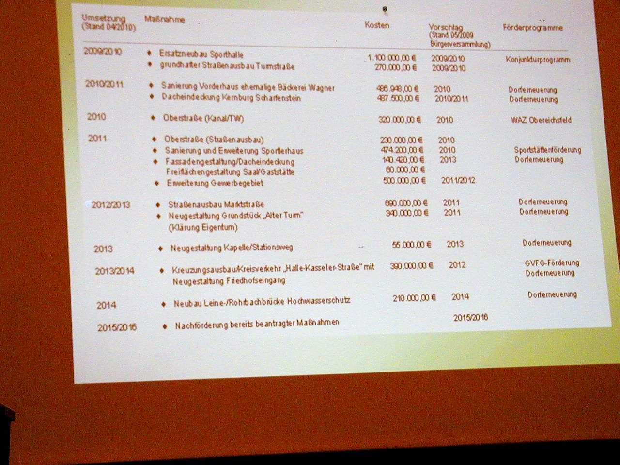 Eine Übersicht aus dem Jahr 2009 zur Informationsveranstaltung in Beuren, was alles wann zur Dorferneuerung im Plan war