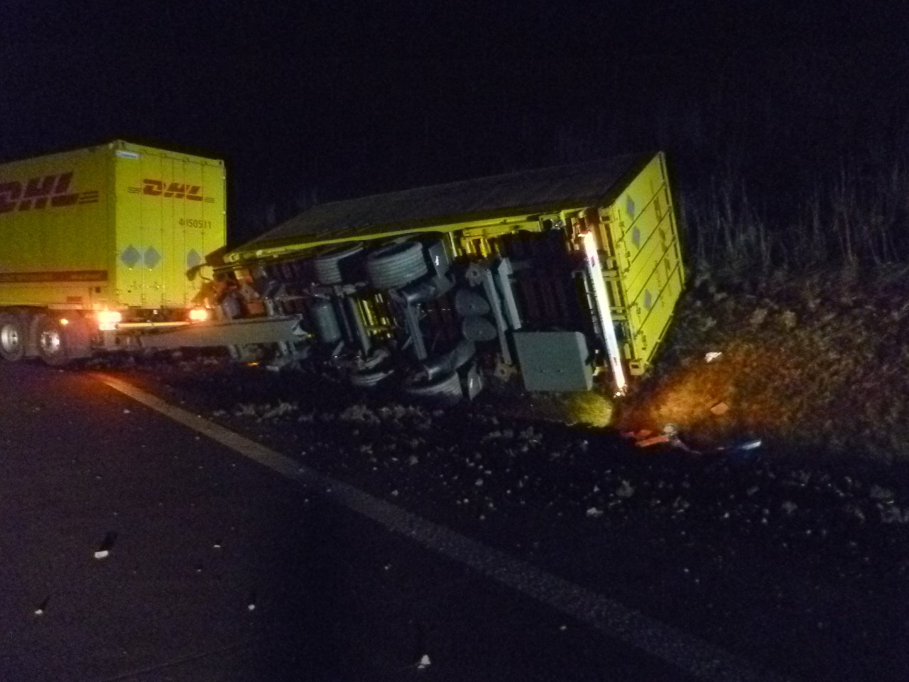 Er konnte das Gespann zwar wieder zurück auf die Fahrbahn steuern, jedoch kippte der Anhänger dabei um. Beim Durchfahren des Straßengrabens fuhr der Lkw mehrere Verkehrszeichen um und beschädigte sich dabei den Kraftstofftank. Etwa 200 Liter Diesel traten aus.