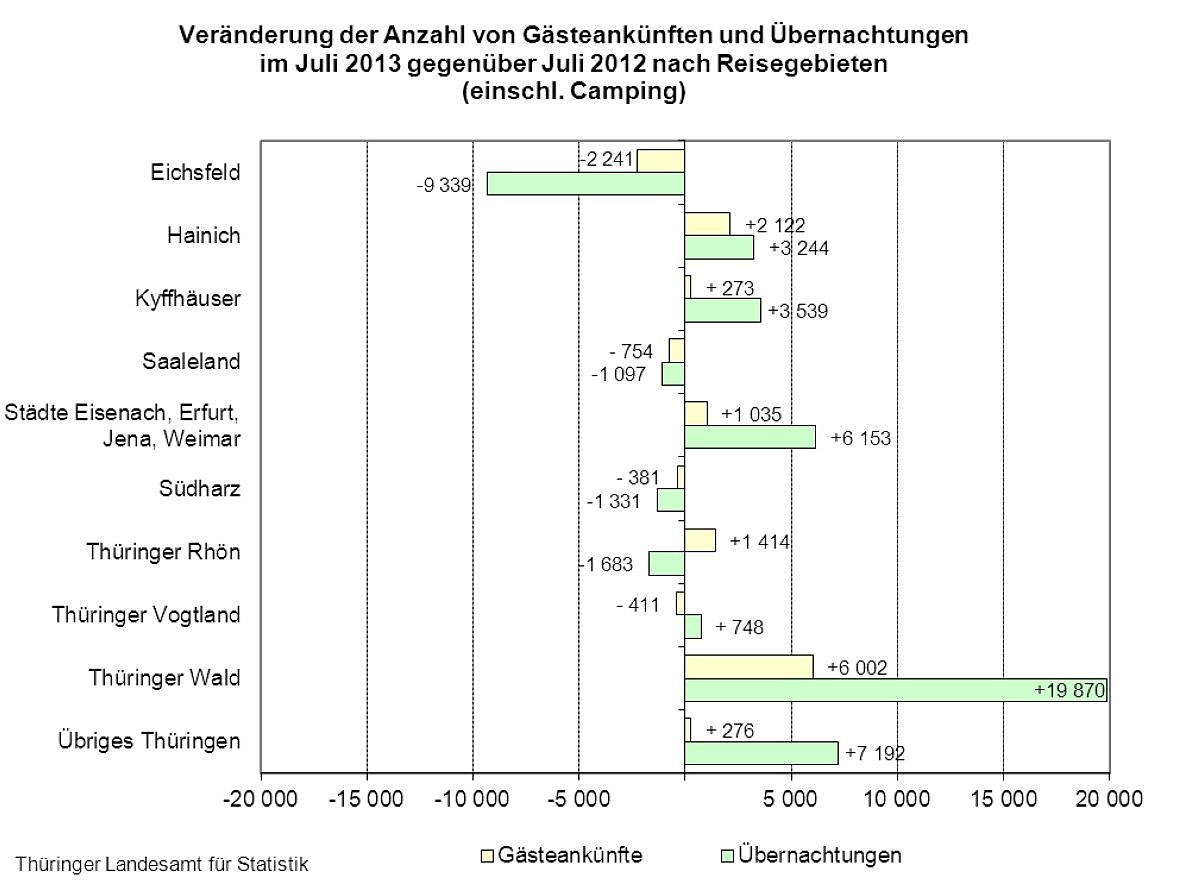 In den ersten sieben Monaten des Jahres 2013 buchten 2,0 Millionen Gäste knapp 5,4 Millionen Übernachtungen in den Thüringer Beherbergungsbetrieben. Im Vergleich zum Vorjahreszeitraum war dies ein Rückgang der Gästezahlen um 1,1 Prozent. Die Zahl der Übernachtungen sank im gleichen Zeitraum um 1,6 Prozent.
