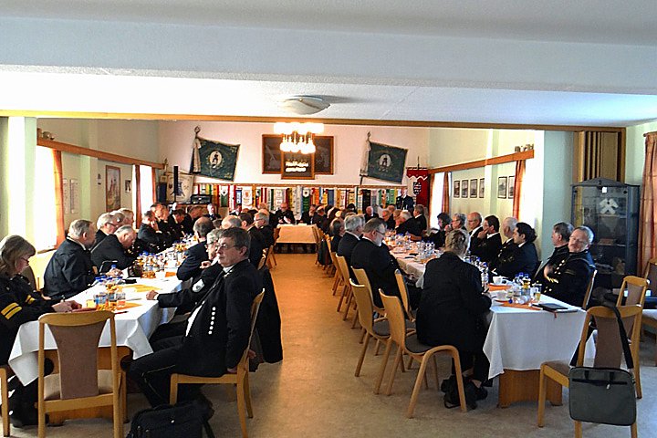 Vor den eigentlichen Beratungen gab es jedoch eine Gedenkminute für die im vergangenen Jahr verstorbenen Bergkameraden Christfried Hädicke und den drei verunglückten Kumpel im Kaliwerk Unterbreizbach. Stehend der Ehrengast Peter Fanselow von der IG Bergbau / Energie.