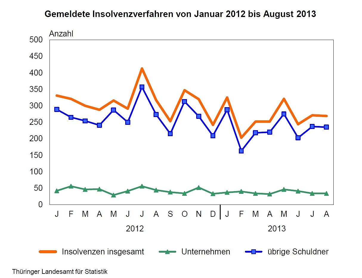 Die Thüringer Amtsgerichte entschieden in den ersten acht Monaten 2013 über 2 137 Insolvenzverfahren. Davon entfielen 13,9 Prozent auf Unternehmen und 86,1 Prozent auf übrige Schuldner (natürliche Personen als Gesellschafter, ehemals selbständig Tätige, private Verbraucher und Nachlässe...