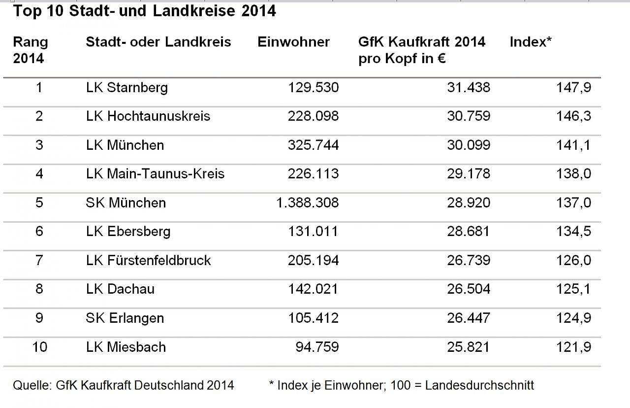 Die Differenz zwischen Arm und Reich zeigt sich in Deutschland mit einer Kaufkraft von knapp 48 Prozent über dem Durchschnitt in Starnberg (31.438 Euro pro Kopf) und bis zu rund 24 Prozent unter dem Bundesdurchschnitt in Görlitz (16.030 Euro pro Kopf). Die Görlitzer haben damit nur knapp 51 Prozent der durchschnittlichen Kaufkraft der Starnberger. Der Stadtkreis Straubing liegt mit 21.180 Euro (Index: 100) genau im Bundesdurchschnitt. Diese statistische Mitte wird umrahmt von den Mannheimern mit 20 Euro weniger pro Kopf (Index: 99,9) sowie den Bewohnern des Landkreis Günzburg mit sechs Euro mehr pro Kopf (Index:100,02).