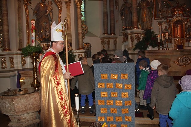 Vor dem Schlusssegen mit dem St. Nikolaus Reliquiar wurden die Taschen vom Kirchenadventskalender mit den Kindern geöffnet und auch Bischof Nikolaus (alias Stephan Kruse, Heuthen) begrüßt. Nach dem Gottesdienst war Gelegenheit zur Adventsbegegnung mit Kaffee und Kuchen und Besichtigung der 15. Krippenausstellung auf dem Gemeindesaal.