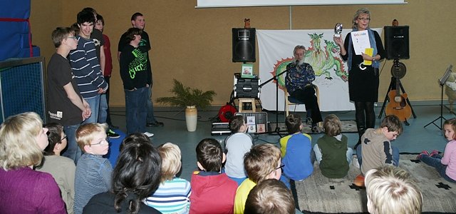 Autor: enIn der Turnhalle warteten gespannt schon die Mädchen und Jungen der Tabaluga-Schule in Worbis. Es waren an jenem Dienstag gleich mehrere Höhepunkte. Bevor die erste Überraschung präsentiert wurde, übergab Schulleiterin Gabriele Müller mit den herzlichsten Glückwünschen eine Urkunde für den zweiten Platz im Basketball.