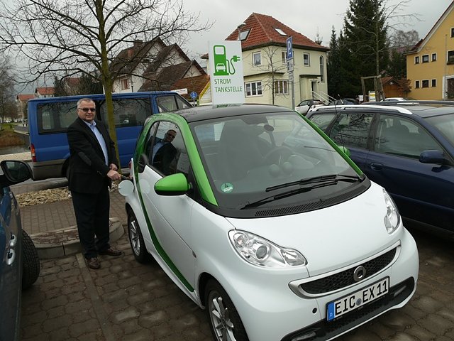 Autor: enKarl-Friedrich Albrecht tankt hier gerade seinen Elektro Smart aus dem Autohaus Peter. Fotos: Ilka Kühn