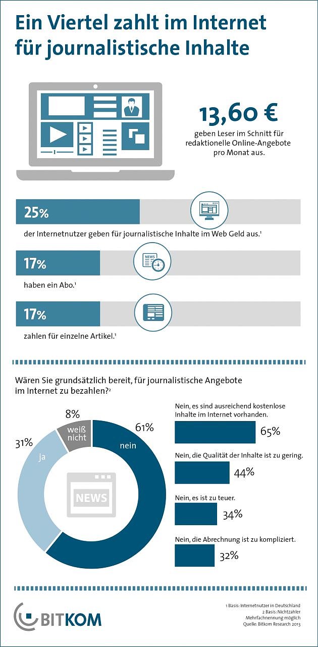 Viele Verbraucher sind bereit, auch für interessante redaktionelle Inhalte im Web zu bezahlen, wenn sie einen angemessenen Preis haben und sich bequem abrechnen lassen. Laut Umfrage geben 17 Prozent der Internetnutzer Geld für einzelne journalistische Beiträge aus und ebenfalls 17 Prozent zahlen eine monatliche Pauschale in Form eines Abos. Die Nutzer lassen sich das nach eigenen Angaben im Schnitt 13,60 Euro pro Monat kosten.