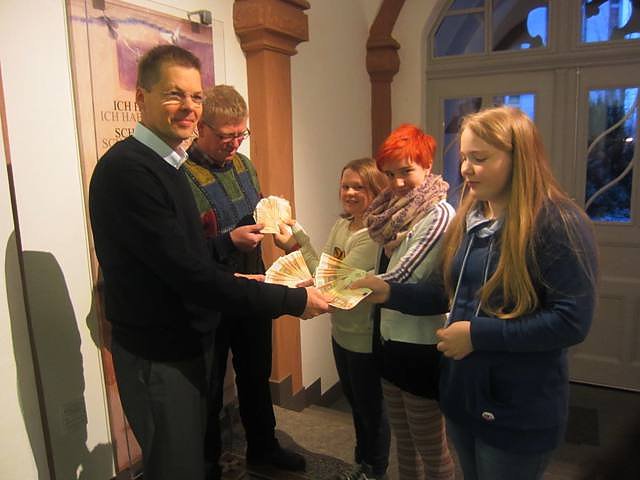 Das Geld stammt aus den Erträgen des Hungermarsches im März 2013, des Basars zum Patronatsfest im November 2013 und aus verschiedenen kleineren Aktionen wie Kuchenverkäufen, die übers Jahr verteilt immer zwischendurch stattfanden.