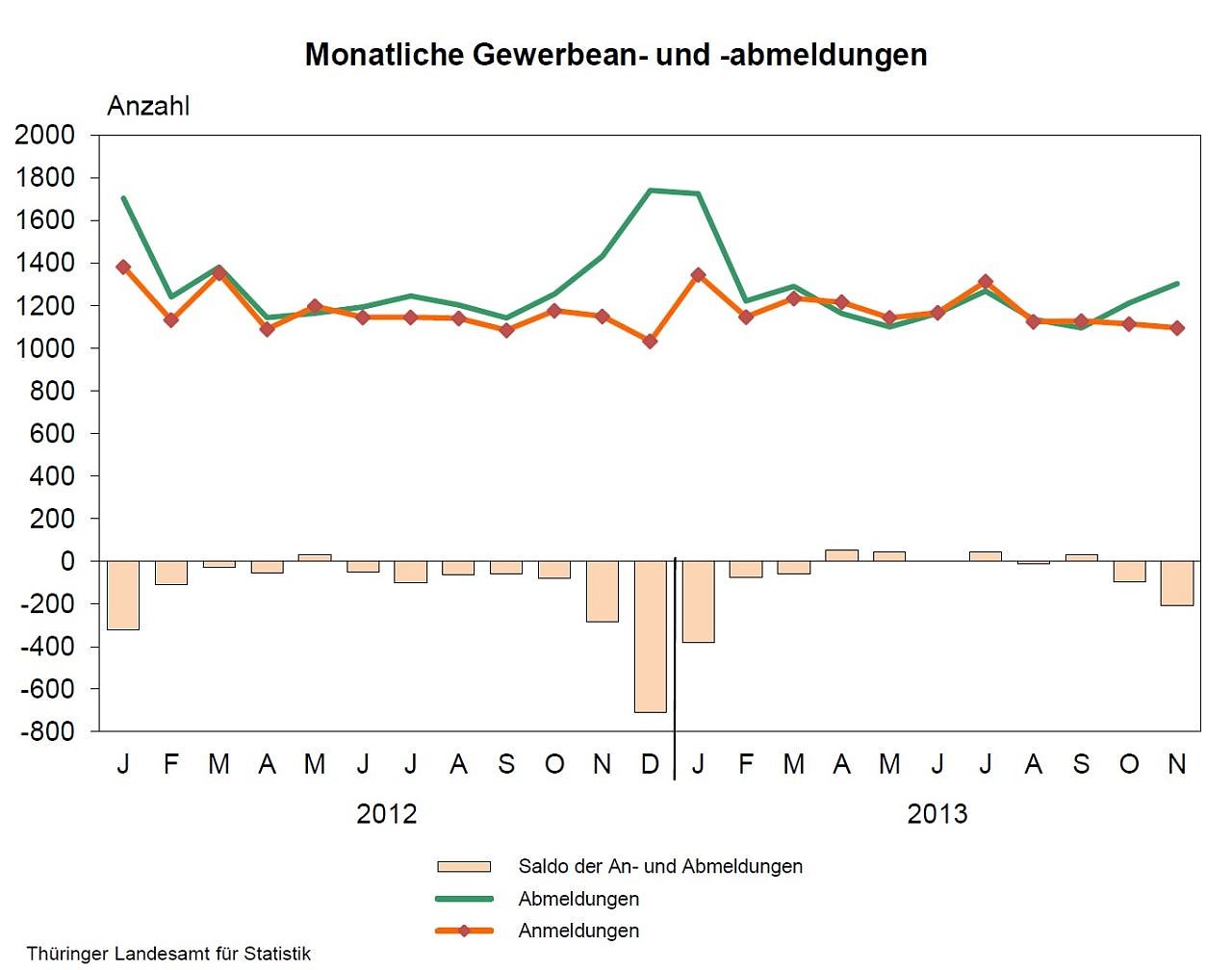Die Anzahl der Anmeldungen lag nach Mitteilung des Thüringer Landesamtes für Statistik mit 13 038 Anzeigen knapp über dem Vorjahresniveau. Die Betriebsgründungen mit größerer wirtschaftlicher Substanz (Kapitalgesellschaften, Personengesellschaften, Betriebe mit Beschäftigten) gingen um 137 bzw. 4,5 Prozent auf 2 874 zurück.