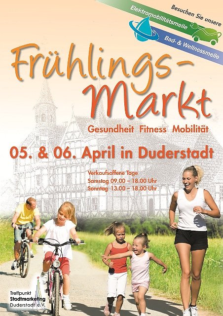 Passend zum Frühlingsanfang mit den wärmeren und wieder helleren Tagen geht der Frühlingsmarkt in Duderstadt auf das positive Lebensgefühl ein. Die Frühlingsgeister werden geweckt und animieren zum Bummeln und einkaufen.Zum Thema Gesundheit gibt es Aktionen für gesunde Ernährung, Wellness, Entspannung, alternative Medizin. Das Krankenhaus wird auch in diesem Jahr wieder seine Leistungen präsentieren und die Fa. Hermann Bach gestaltet in Zusammenarbeit mit örtlichen Handwerkern einen Bereich zum Thema Wellness.
