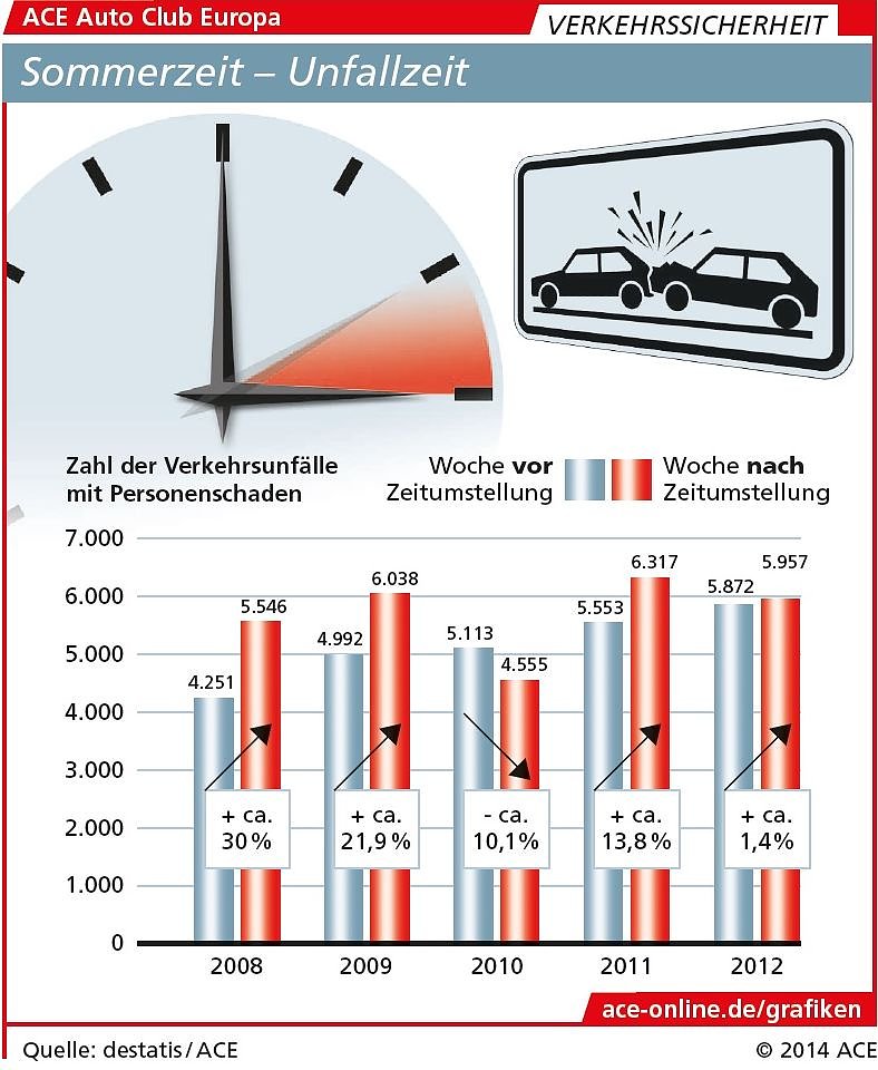 Schlafdefizit, Temperaturanstieg und zunehmender Freizeitverkehr, diese Kombination begünstigt offenbar den Anstieg des Verkehrsunfallrisikos, vermutet der ACE Auto Club Europa Kreisclub Nordhausen. Dabei stützt sich der Club auf Angaben des Statistischen Bundesamtes, denen zufolge immer nach der Umstellung auf die Sommerzeit ein teils deutlicher Anstieg der Zahl schwerer Verkehrsunfälle verzeichnet wurde. Der ACE zitiert zudem Angaben des Deutschen Verkehrssicherheitsrates (DVR), wonach jeder vierte Unfall in Deutschland auf Sekundenschlaf zurückzuführen ist.