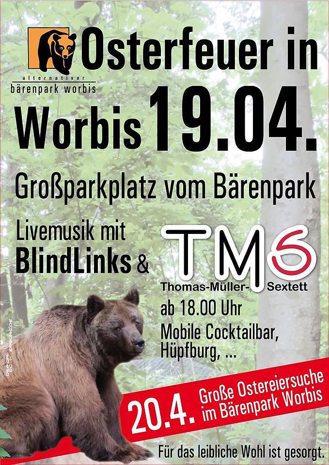 Ab 18 Uhr sind alle Interessierten Willkommen und zwar auf dem Parkplatz beim Bärenpark, gegenüber vom Schützenhaus. Es erwartet alle ein toller Abend mit Livemusik und Unterhaltung mit bester Rockmusik mit der Gruppe TM6 und der Band BlindLinks. Selbstverständlich ist auch für das leibliche Wohl bestens gesorgt.20.04. – Am Ostersonntag veranstaltet der Bärenpark Worbis, wie jedes Jahr, die große Ostereiersuche. Ein riesen Spaß für die ganze Familie. Die jungen Besucher erwartet ein super Programm mit Spiel, Spaß und Spannung. Wer mit macht, wird vom Bärenparkteam mit kleinen Ostergeschenken belohnt.