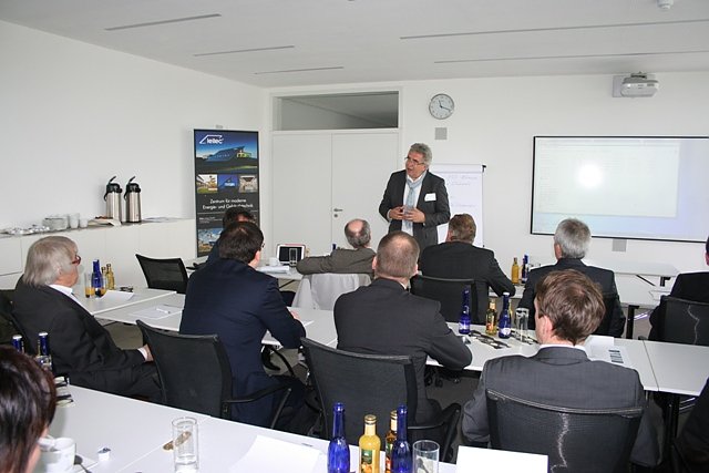 In seinem Vortrag "Vom Passivhaus zum Plusenergiehaus" stellte Herr Kruse ein Forschungsprojekt vor, bei dem ein Gebäude durch innovative Architektur und mit Hilfe von PV-Anlagen und einer Solarthermieanlage so viel Energie produzieren und durch neuartige Technologien selbst speichern kann, dass es für den Bedarf einer vierköpfigen Familie und deren zwei Elektroautos reicht. In der anschließenden Besichtigung des Firmengebäudes konnten sich die Teilnehmer vom außergewöhnlichen Energiekonzept mit modernster Gebäudetechnik überzeugen.