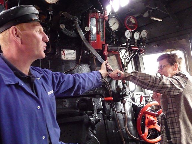 Aus der Eichsfelder Delegation durfte Monika Eck aus Leinefelde als Erste die Lok fahren. Bequem, über eine extra, außen aufgestellte Treppe, gelangte sie auf den Führerstand der Lokomotive, wo ein Heizer und der erfahrene Dampflokführer Manfred Riesel bereits auf sie warteten. Vor Ort erfolgte eine nochmalige Einweisung und Monika Eck setzte die Lokomotive unter Anleitung ganz langsam in Bewegung. Aber schnell nahm das riesige, schnaufende Gefährt an Geschwindigkeit zu und entwickelte dabei ungeahnte Kräfte. Langsam bremste Monika Eck die Lok am Ende der Strecke ab und kam zum Stehen, bevor sie wieder zum Ausgangspunkt zurückfuhr.