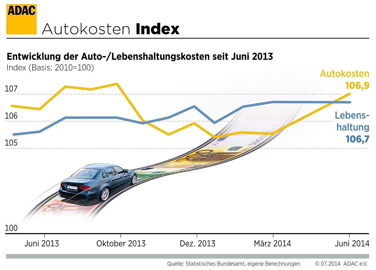 Dies sind die wesentlichen Ergebnisse des aktuellen Autokosten-Index, den der ADAC gemeinsam mit dem Statistischen Bundesamt quartalsweise veröffentlicht. Damit liegt der aktuelle Kraftfahrerpreis-Index, der sämtliche Preise rund um Autos und Motorräder erfasst, bei 106,9 Punkten, der Index für die allgemeine Lebenshaltung mit 106,7 Punkten knapp darunter. Beide Indizes wurden letztmals für das Jahr 2010 auf den Basiswert 100 gesetzt.