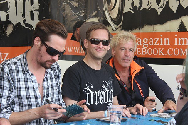 Aber auch im Vorfeld ließ es sich die Band nicht nehmen bei einer ausgiebigen Autogrammstunde den Fans, die in einer nicht enden wollenden Schlange auf ihre Helden warteten Rede und Antwort zustehen und alles zu unterschreiben was man ihnen unter die Nase hielt. So wurden Fotos, CD Cover, T-Shirts, Jacken Arme und Beine genau so unterschieben, wie Biergläser oder mitgebrachte Luft- Gitarren.
