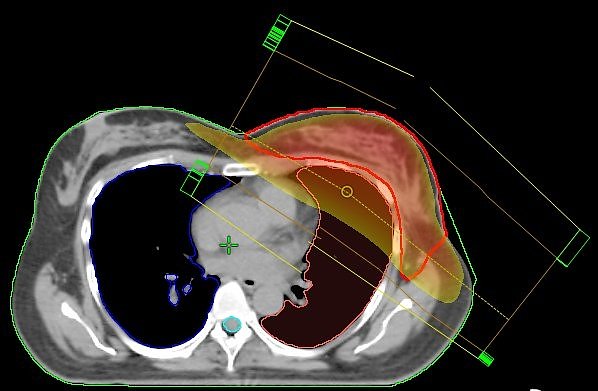 Normal: Stehfeldtechnik mit 2 Feldern (Standardtechnik); der Hochdosisbereich erfasst nicht nur das Zielvolumen (rote Kontur), sondern auch die umgebenden Risikoorgane (Lunge und Herzkranzgefäße), was zu Nebenwirkungen führen kann