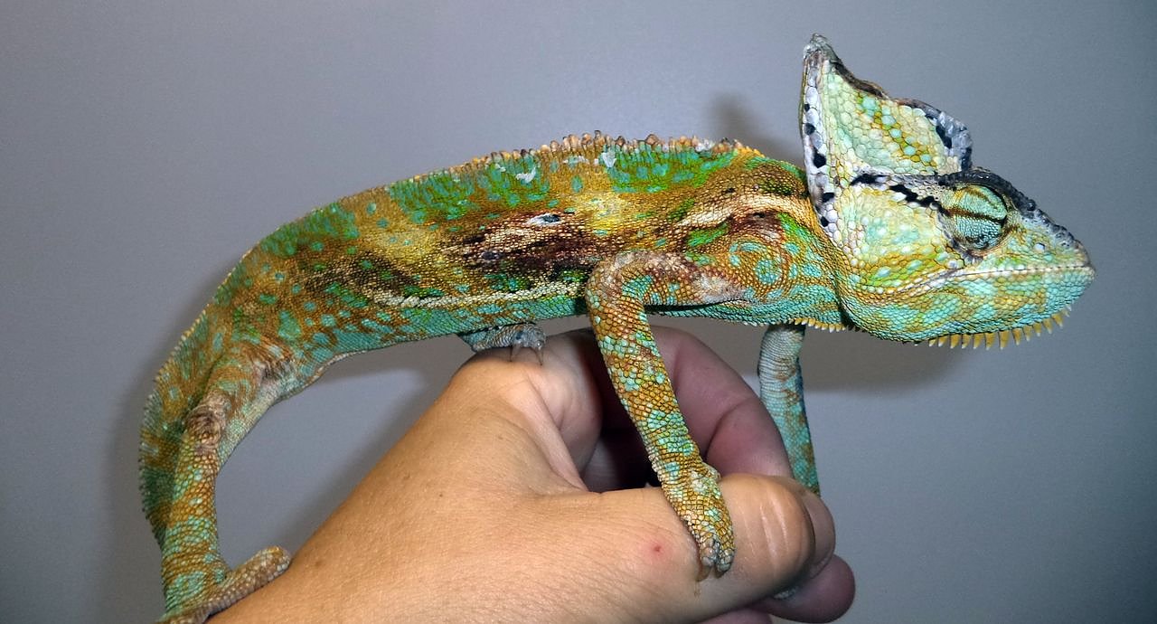 Am Dienstag nachmittag wurde dieses Chamäleon in Niedersalzas Drosselgasse eingefangen. Es war so wütend, dass seine Farbe schwarz/braun war.