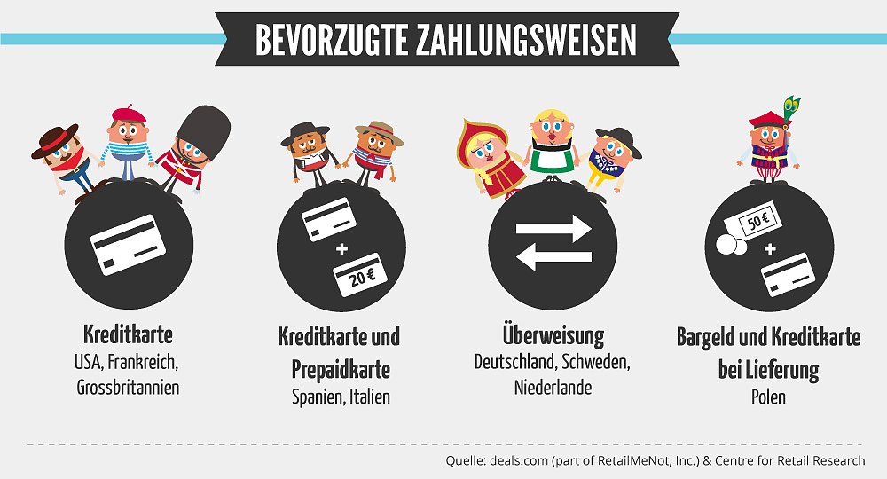 Deutsche entscheiden sich bei ihrem Online-Einkauf so selten wie kaum ein anderes Land für die Zahlung per Kreditkarte. Während diese Zahlungsmöglichkeit in allen anderen untersuchten Ländern zu den beliebtesten gehört, bevorzugen deutsche Konsumenten die klassische Überweisung – rund 40 Prozent der Einkäufe werden auf diese Weise bezahlt. Dahinter folgen Bankeinzug (19 Prozent) und Online-Bezahldienste wie PayPal (17 Prozent).