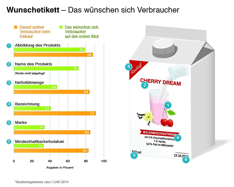 An die Vorderseite eines Lebensmitteletiketts haben Verbraucher konkrete Erwartungen. Sie wollen sich beim Einkauf schnell orientieren: Name, Bezeichnung, Produktbild, Nettofüllmenge, Marke und Mindesthaltbarkeitsdatum (MHD) gehören laut der repräsentativen Studie auf die Vorderseite.