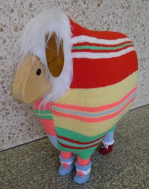 Die Stämme der Bäume vor der Stadthalle mit bunten Schaals umwickelt, das Leineschaf zum Stadtfest an Stelle des wärmenden Wollfells im schicken bunten Strickkleid.....